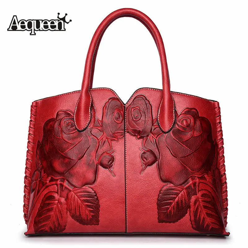 صور من 2019 الأحمر جلد طبيعي النساء حقائب Crossbody أكياس للسيدات اليد العرقية زهرة تنقش Messneger حقيبة المؤنث بولسا