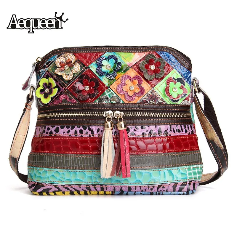 معرض من AEQUEEN المرأة حقيبة جلد طبيعي الإناث خليط زهرة رسول Crossbody أكياس للسيدات قذيفة حقيبة بولسا لون عشوائي