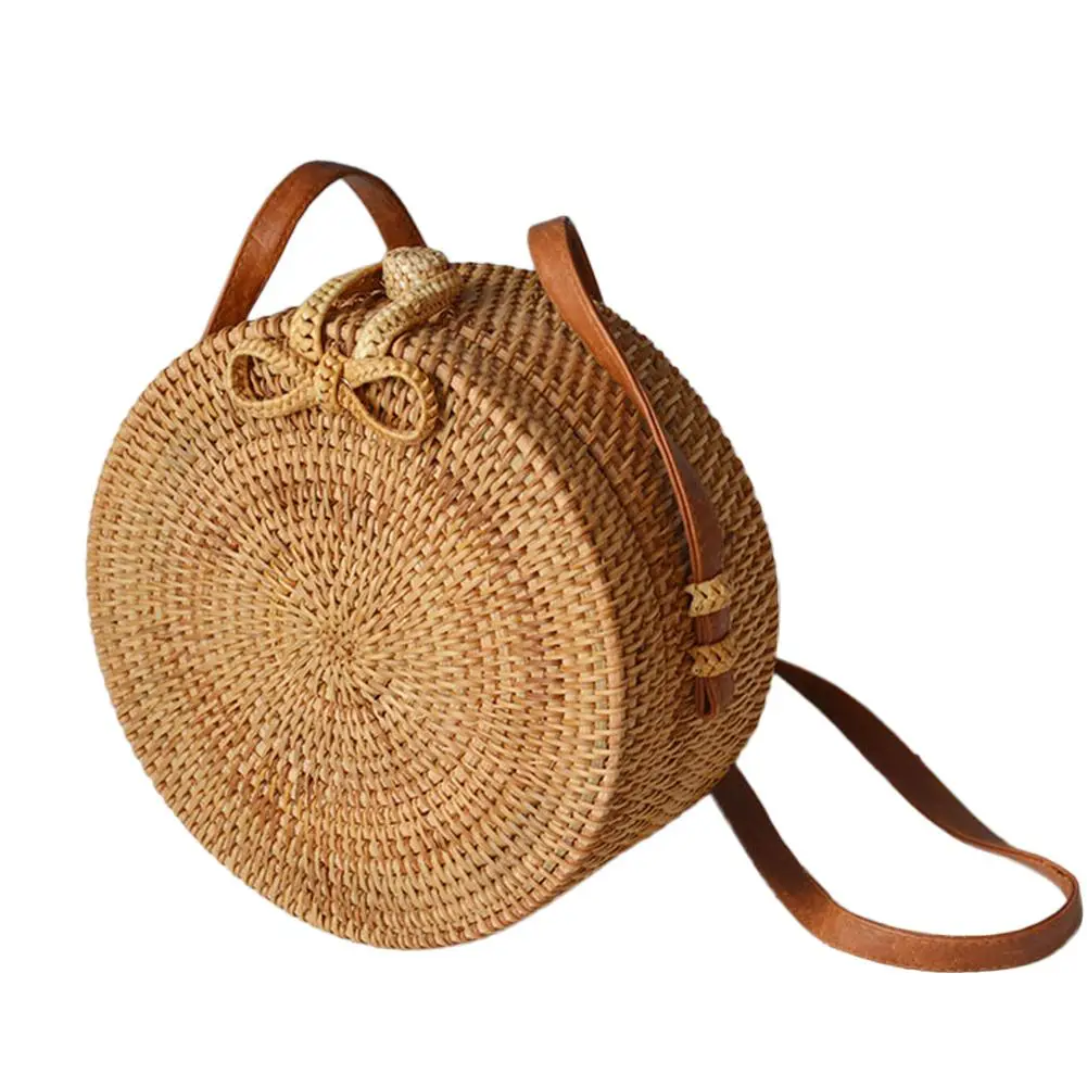 صور من اليد-المنسوجة جولة كيس الروطان الطبيعي Crossbody حقيبة المألوف الشاطئ القش مضفر أكياس للنساء حجم 20*10 سنتيمتر