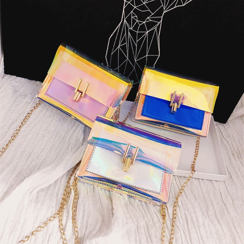 أرغب في شراءمعلومات اضافية النساء الليزر Crossbody حقيبة رسول حقيبة كتف PVC هلام صغيرة حمل حقيبة ساع الليزر الثلاثية الأبعاد سيدة