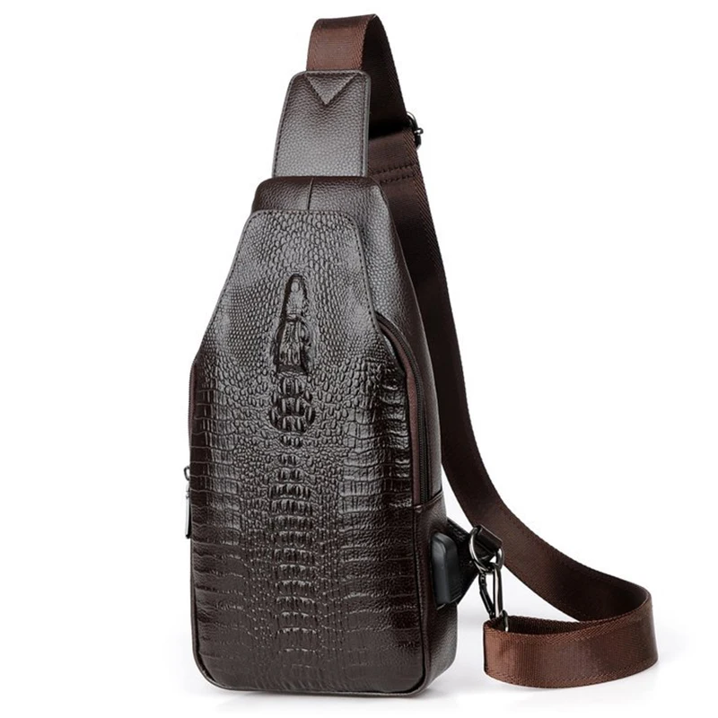 معرض ل جديد أزياء الرجال حقيبة صدر للرجال حقيبة ساع جلدية USB شحن عارضة الرجال سفر حقائب كتف التمساح نمط Crossbody حقيبة